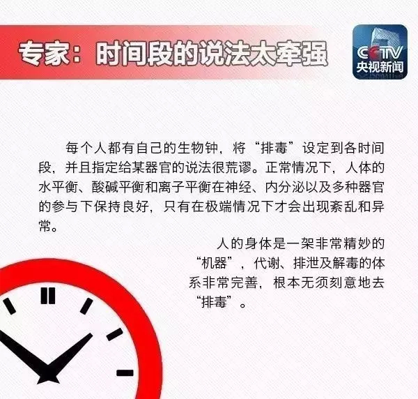 那么,“人体排毒时间表”真的具有科学性吗?专家表示,每个人都有自己的生物钟,而某个器官在特定时间段进行排毒的说法很牵强,因为人的代谢、排泄以及解毒的体系非常完善,根本无须刻意地去“按时排毒”。